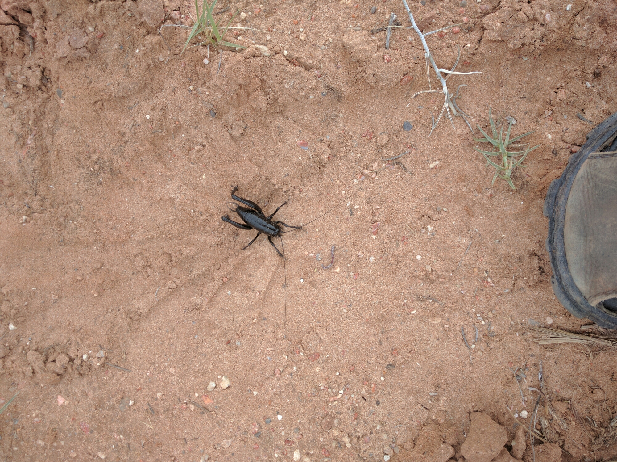 I woke up, packed up, and noticed about a dozen of these black, pincer bearing, fuzzy feet having, cricket type things ambling about in my general vicinity.