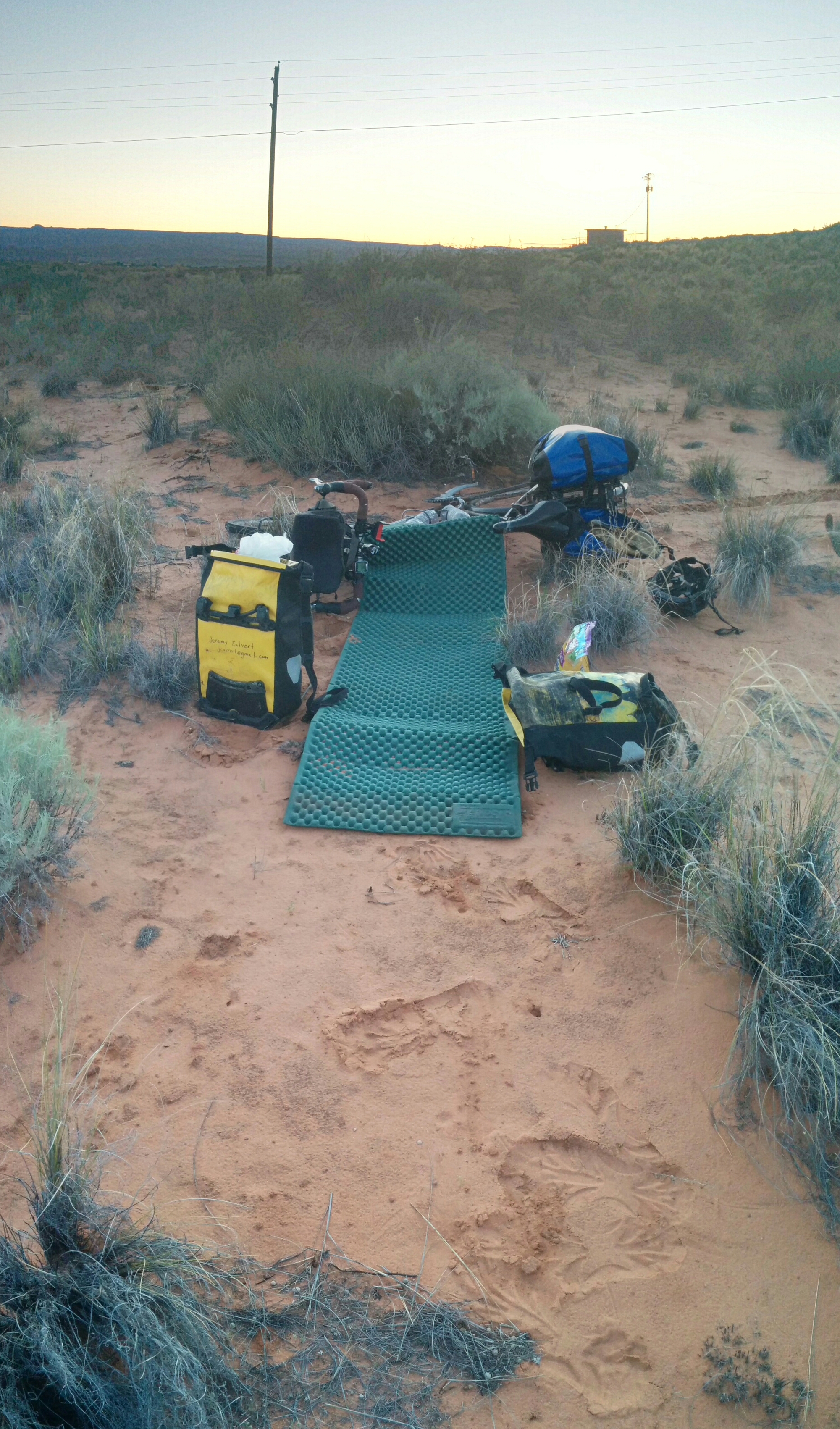 There was a campground in Page, just down the hill on which the town center sits, and when they didn’t answer the phone when I called, I made the the mile trip and a small descent to check it out in person. The sign said there was no vacancy, but really, I needed all of 25 square feet of ground for me and my bike, so asked at the front desk if there wasn’t somewhere I could squeeze in. They said sorry, but no, so I thanked them, left the office, and cruised the grounds with a mind towards finding some campers that might be interested in my company. There were surprisingly few people actually outside at any of the RV sites, and none of them looked particularly eager for company. There were no signs of other bike tourists and nobody sitting outside at any of the tent sites. So I determined me staying at that campground was not meant to be, and headed a little further out of town. I found a paved road that seemed defunct based on the bulldozed dune of sand shortly past where it branched from the actual rode I was on, and took that to a dirtbike track, and then took that to a nice, flat, and inconspicuous little impromptu campsite.