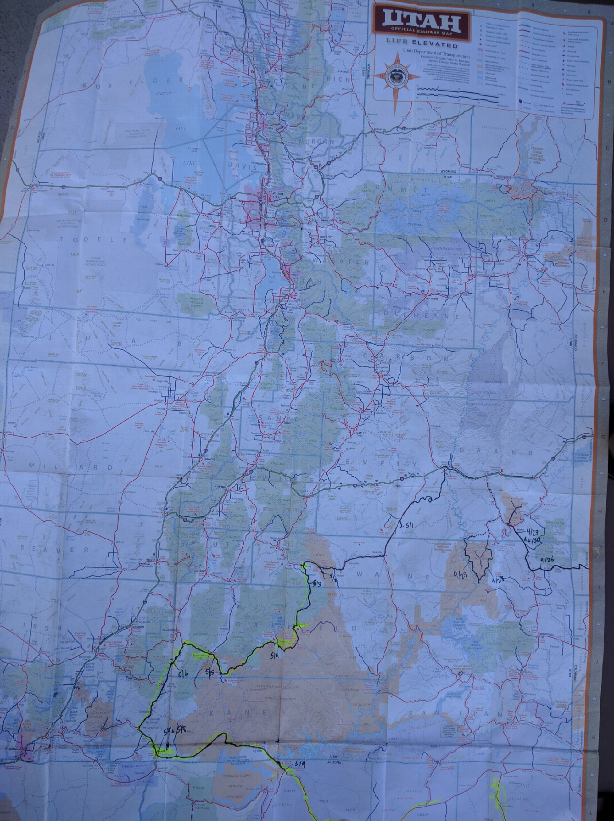 With the time change, and waking up when it got light out as I was sleeping in the open, sans bivvy, I was packed up and headed back into Page before 6am. Not much was open yet, so I went to Safeway, stocked up, grabbed a Starbucks latte, and dicked around, tracing my route through Utah on the paper map pictured below (add defective photo-captions to the list of bugs with the WordPress android app) and making adjustments and tune-ups to the bike for a while.