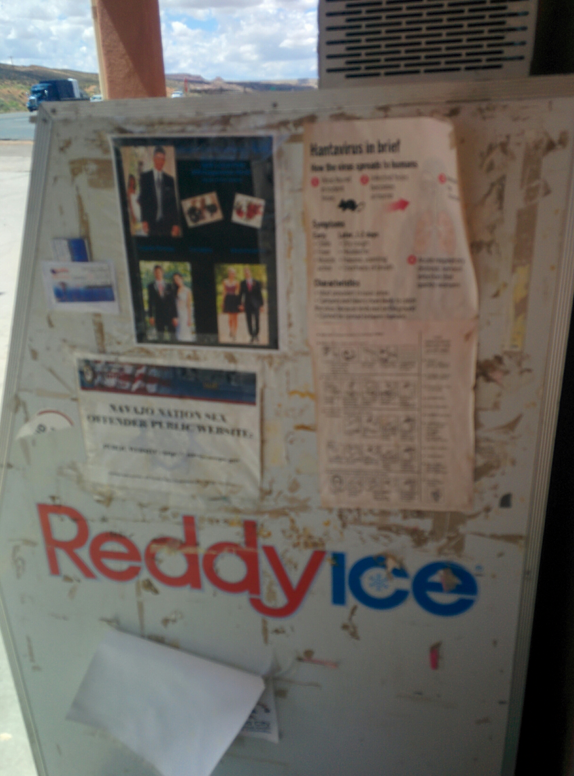 At 50 miles into the day I got to a junction and the first services since Page. I was still fine on water (having started with 4 liters), but I took the opportunity to have a coffee and a sit in the shade. There were some depressing flyers on the ice machine.