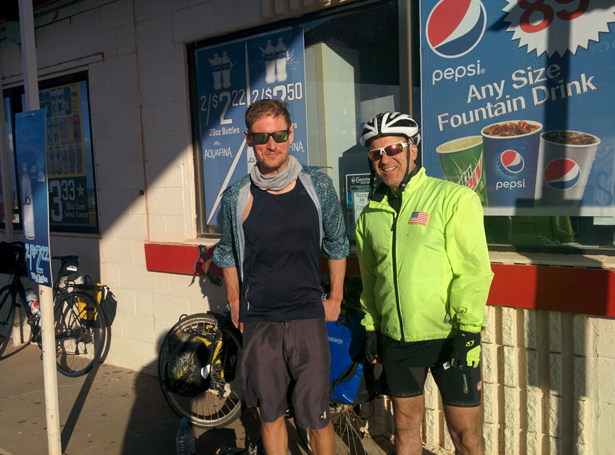 We walked back outside, and the two of them continued in their incredulity. They asked if my mom knew what I was doing, which seemed an odd thing to ask given my age, but instead of pointing this out and telling them how old I was (a grown-ass man), I accepted the implicit compliment that I look young for my age, and gave them the simple and honest answer that yeah, she was worried about me, but kept tabs on my location through Google+ location sharing and this blog. I asked the Jersey cyclist if he’d like my blog info. I gave him one of my Amazon business cards with my standard hand-scrawled modifications (@amazon.com crossed out to @gmail.com, .wordpress.com appended to my name), and asked what his name was. It was Mitch.