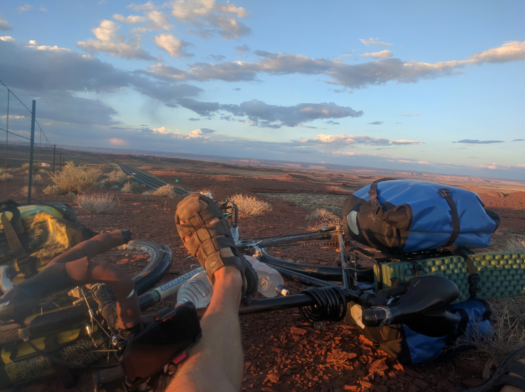A few miles later I got to a section of road that had been blasted through a rocky bluff that was maybe 25 feet high. I managed to push my bike up one side, and while I was well illuminated by the setting sun, if I got myself and my bike close to the ground, we were only visible to cars at some distance, and from such distance only a couple of small specks. Moreover, I had a fantastic view of the sunset which I enjoyed while staying low, reading, relaxing, and dumping the inefficiently large remainder of the cheap trail mix I had by then transported 170 miles from Kanab, into my mouth.