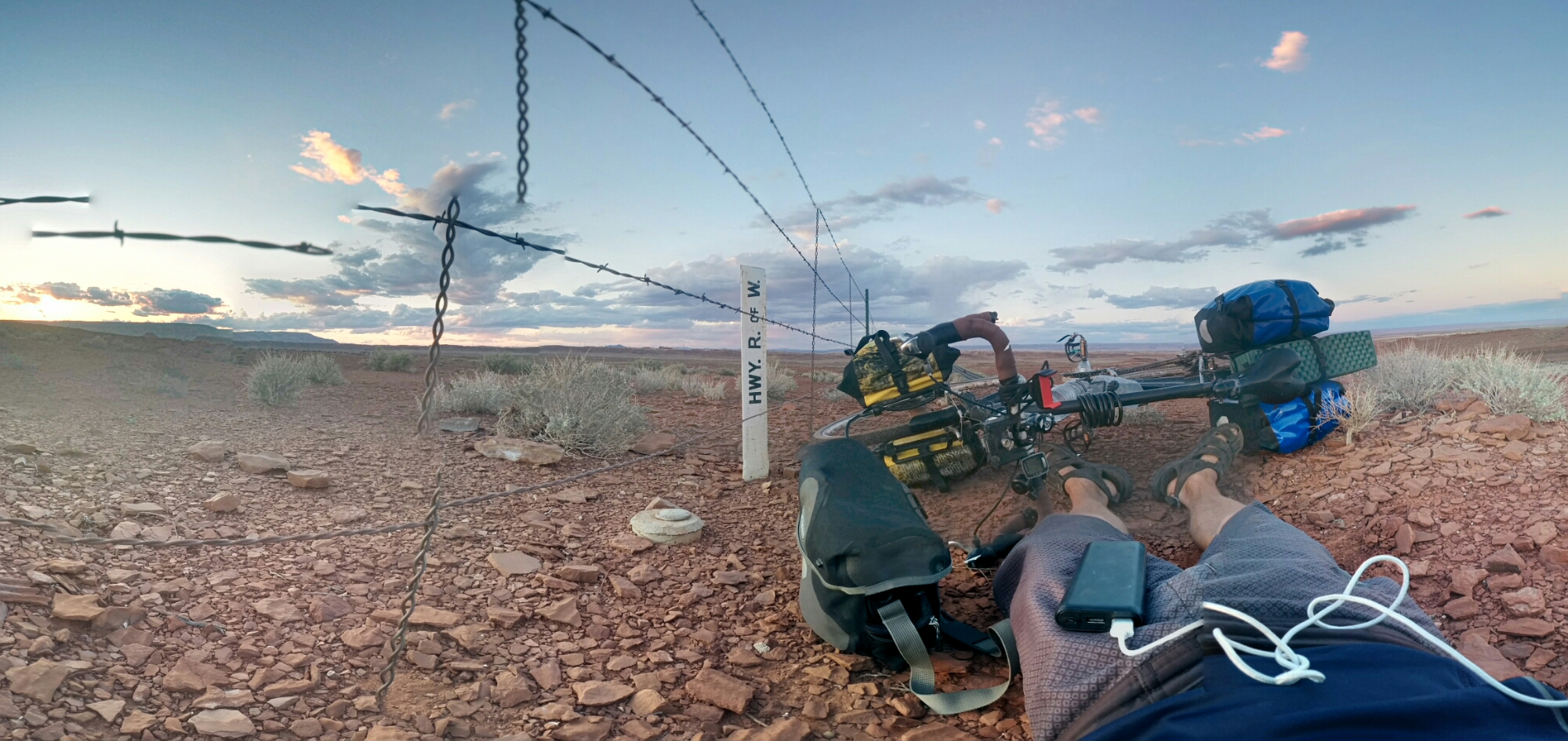 When the sun had set and there was still enough light for me to see at short range but not enough light to be at all visible from the road, I set up camp. Sleep was clearly going to take me as soon as I put the phone away, which surprisingly had a trickle of data, when I noticed some flashes off in the distance in my periphery. Clouds were rolling in, and when I stared off into them for a couple of minutes I verified that it was lightning. It was of the ‘heat’ variety, very distant, and not likely ‘touching down’, but judging by the USGS survey marker next to my head that noted the elevation, and the unobstructed views of the horizon, or at least to very, very distant formations, in nearly every direction, I determined that I was at the highest elevation for a long, long ways, even if only by a couple dozen feet. Moreover, monitoring the movement of the boundary of the clouds that housed the lightening against the backdrop of stars, I determined they were moving in my general direction. It seemed clearly ill-advised to go to sleep in this configuration, but nested so firmly in the clutches of such a welcome drift into slumber, it took me some time to work up the energy to do the thing I knew it was prudent to do. Eventually, I crawled out of the bivvy, scooped it up with pad and bag inside, and carried it down the bluff to lower ground, leaving my bike and bags at the top to be struck by lightening if that’s what needed to happen. I definitely wasn’t going to be packing or shuttling my things, in the dark, half asleep.
