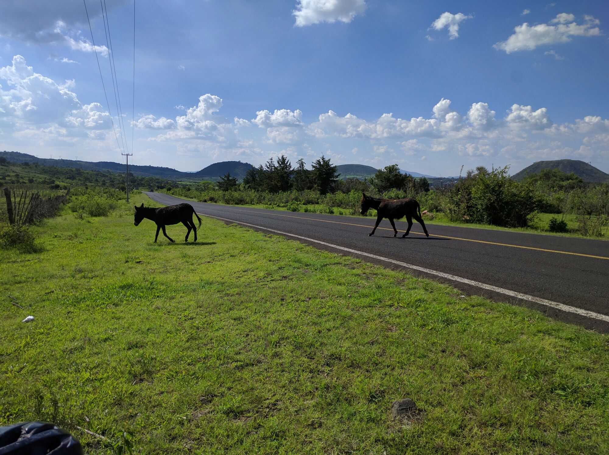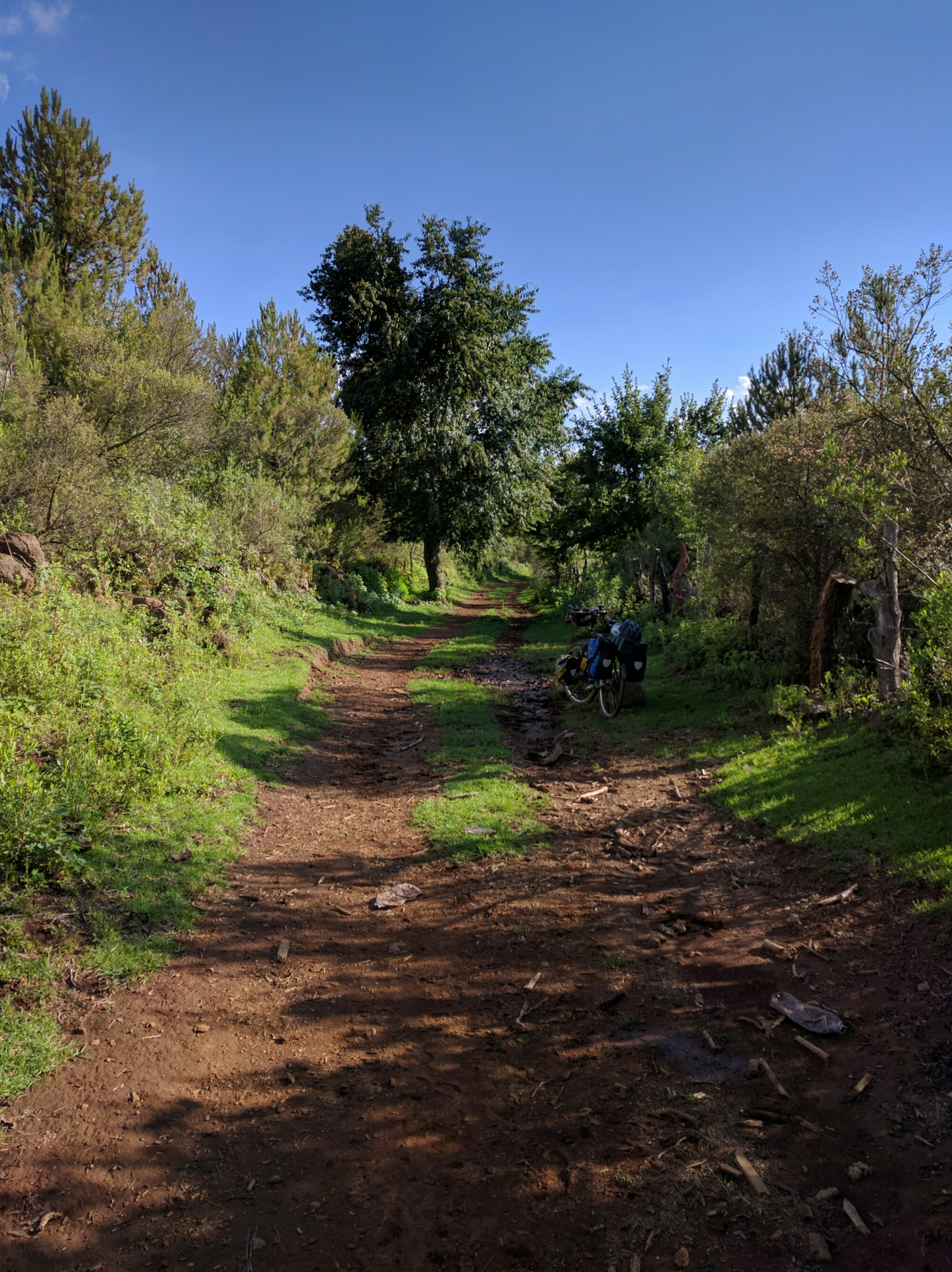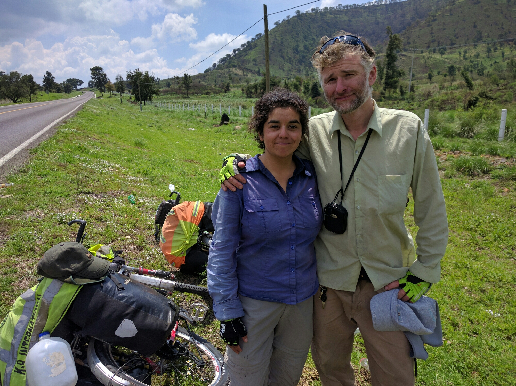 The following day, the initial climb is tough but not grueling, and just as I get to the top I meet a couple of bike tourers going in the opposite direction. We stop and chat. The guy is from France and Luz, the woman, is from Chile. They’ve come up from Central America, and have not a lot of good things to say about the cycling down that way. But then, they’re also critical enough of a number of things (my fledgling Spanish skills, for example) to suggest that they’re glass-half-empty kinda folks, which I can appreciate, but also makes me take their opinion of the region with a little more salt than I would otherwise. They also give me the info of someone I might stay with on the way to Mexico City. They are averse to paying anything for accommodations, whereas I’m fine with spending $10 a night to not have to deal with logistics of finding a host, and then worry about being sufficiently grateful to them for putting me up for free. Of course, in very remote areas, camping is cost and hassle free. It looks like I’m getting back into sufficiently remote areas for camping, but have not been for the last few weeks. Anyways, we exchange information, them telling me about stuff further South, me telling them about stuff further North, and then part ways. They have a easy 50km descent to Zamora, their destination for the day, whereas I have another 60km and more climbing (and a TBD amount of off-roading) to do for the day.