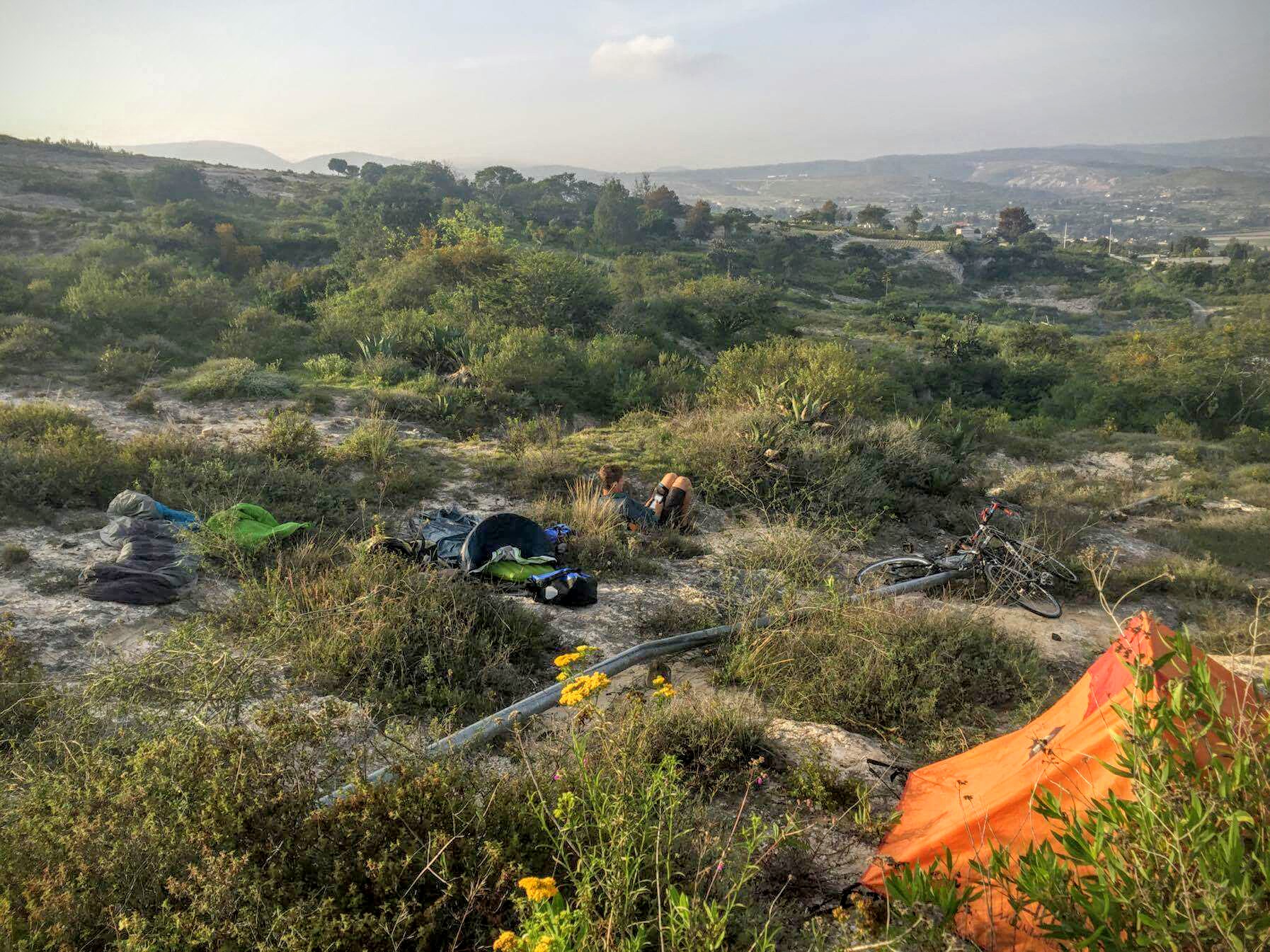 We follow the hand drawn map which takes us up a very steep city street into an area where the street lights stop. It leads to a slope-y field that we explore by moonlight. Villagers walk by occasionally by car and on foot, but other than to say “buenos [tardes]” they don’t seem to care that we’re pretty clearly setting out to camp. The dogs from the surrounding properties, on the other hand, are livid. We get up the slope pretty far, and the dogs barks have subsided. We’re nearly done setting up our tents in the dark when a couple of dogs start barking and approaching us. We can’t see them, but Jung reassures me he has a stick, by which he means the tiny fiberglass poles of his 1-person tent. If that gives him confidence, that’s what matters. I’m disconcerted, but not particularly fearful, in large part because there are two of us. I stand up to stand them down, though I still can’t see them. I yell “GO HOME!” a couple of times, assertively, but not so loud as to disrupt the neighbors, and throw a rock or two into the general direction of the barking for good measure. This seems to do the trick, and we’re not harrassed again until we descend in the morning.