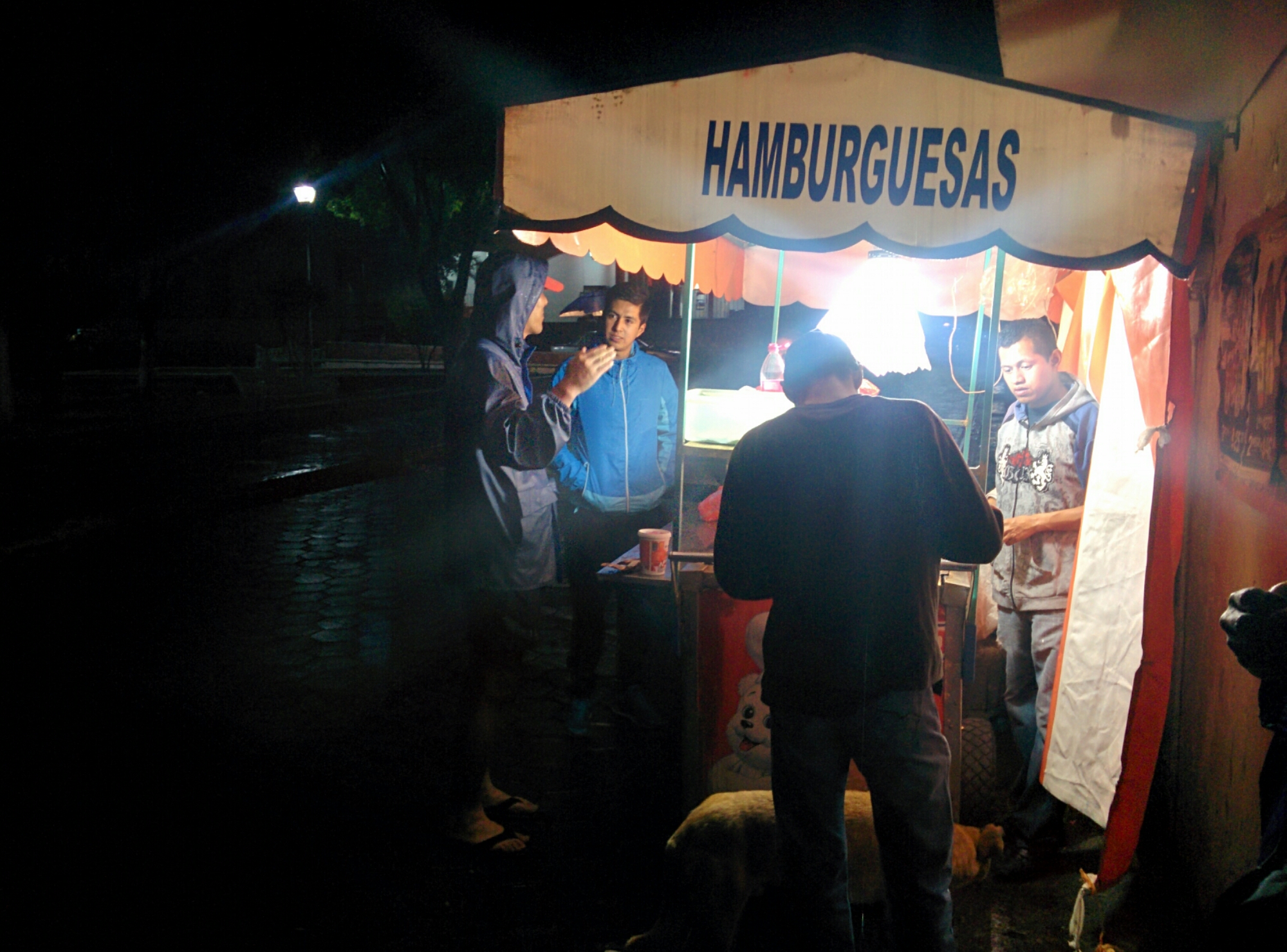We get a room, take showers, and then head out to get something to eat. The walking and the showering has taken a while and when we set out it’s 9pm and well past dark. The town is quite small and dining options are accordingly limited. In fact, the only place serving hot anything is a burger stand. Through some series of miscommunications, I order 2 burgers, which I’ve just learned by watching a previous order are loaded with, in addition to a patty, 2 kinds of cheese, ham, and pineapple. The burger guy, and I for that matter, thought that Jung would have one, but he declines. I’m fine with that, and I eat one then the other, standing under the awning out of the rain, on the spot. Then Jung decides he’d like one, but in the process of trying to get 1 with 2 patties, he gets 2 separate, fully loaded burgers as well. While the caloric consequences of these miscommunications is far from negligible, the financial consequences are, as each burger costs 27 pesos ($1.50). Jung eats one back in the room just before we pass out.