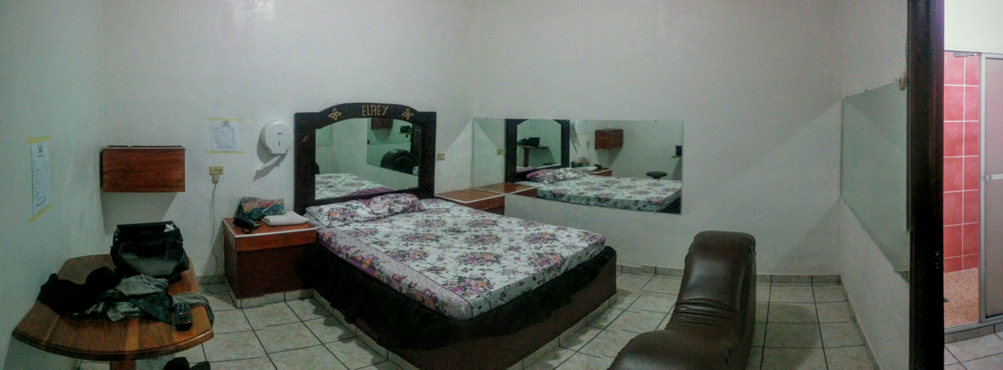 I miss the turn for the first town where we decided to look for a hotel, but we’re not far from another, larger town called Acajatel that has more promise for lodging, so I propose we continue on. Ryu is game for whatever. When we get there, it’s quite industrial and gritty, and when we pull into a street with small markets and the first town-like activity we see, we get leers from many of the locals. Ryu takes the lead in asking a group of women if there’s a hotel nearby, for which I’m grateful, as I’m feeling both intimidated and irritated by the reception we’re receiving. We get directed, we think, to go back out to the road we turned off, and continue on. As we ride off to do so, we get a number of whistles, including one deafeningly loud cat call. I’m wearing a scarf that Pao gave me, which I usually have pulled up over my face for sun protection, but which I don’t currently and I suppose is fairly effeminate by El Salvadorian (or Central American, in general) standards. Ryu is wearing cycling shorts, as am I, but whereas I cover them with board shorts, he doesn’t. Again, not something a local man would likely be caught dead in. The cat call makes my blood boil, but there’s no good option other than to act as if I don’t hear a thing. Ryu seems to do the same calculation.