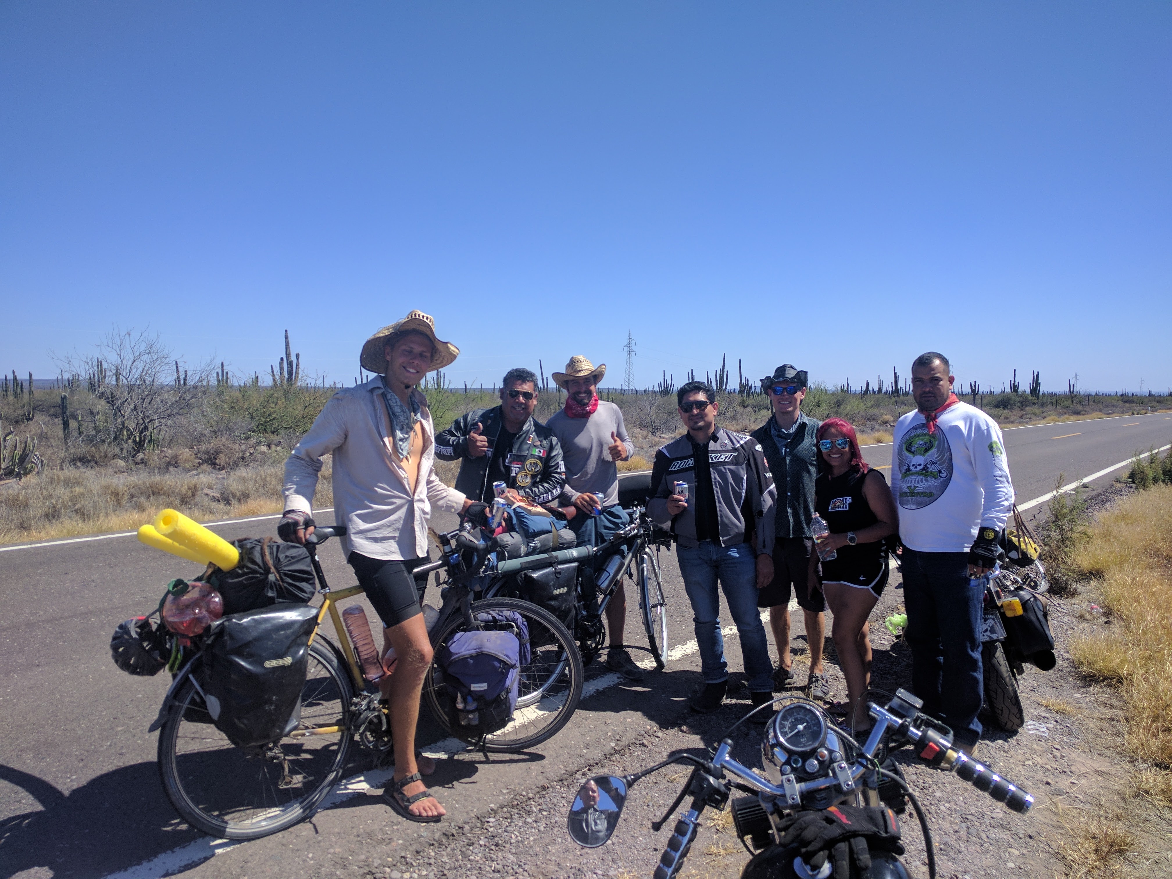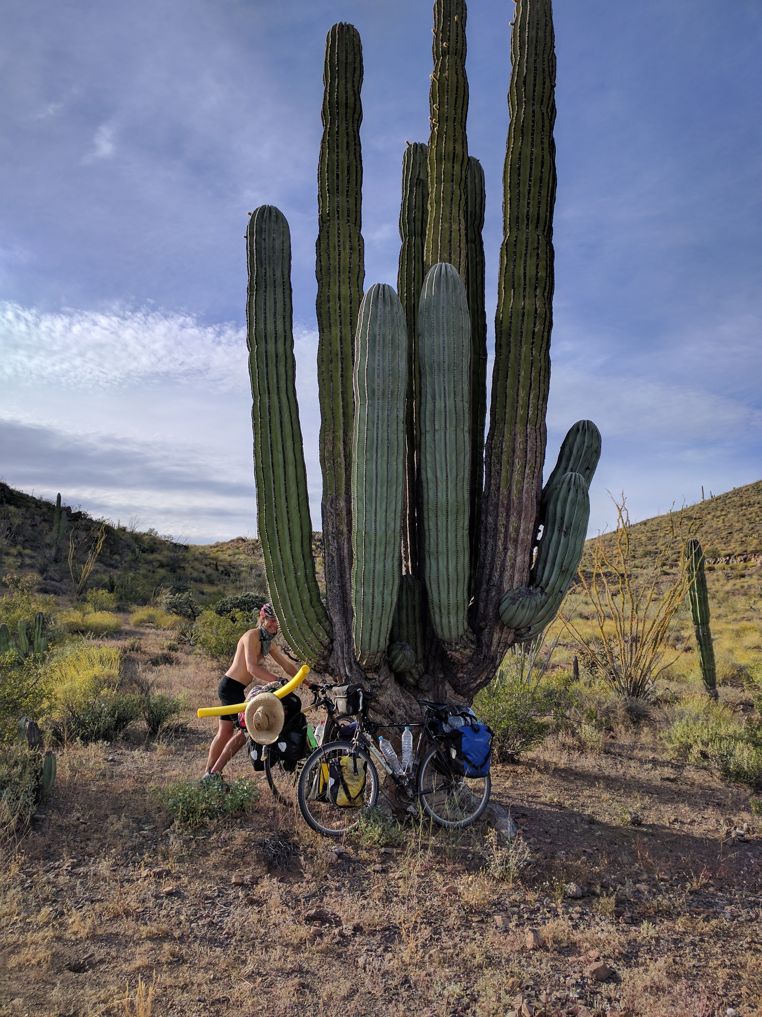 Getting off road. Particularly before branching away from the Pacific coast at El Rosario, we pushed the limits of what our loaded bikes with 700cc x 40mm wheels can get through. For 4 or 5 days we were riding along the Pacific coast, along cliffs and through dunes, going 5-10K back to highway-side towns to resupply on food and water. We still look for “short”cut opportunities to get off road, but Hartley’s racks are starting to break, and our bodies have reached their limit of bumpy washboard. We’re resolved, in future trips, to slim down our gear and beef up our wheels and racks (which will entail getting frames that can accommodate).