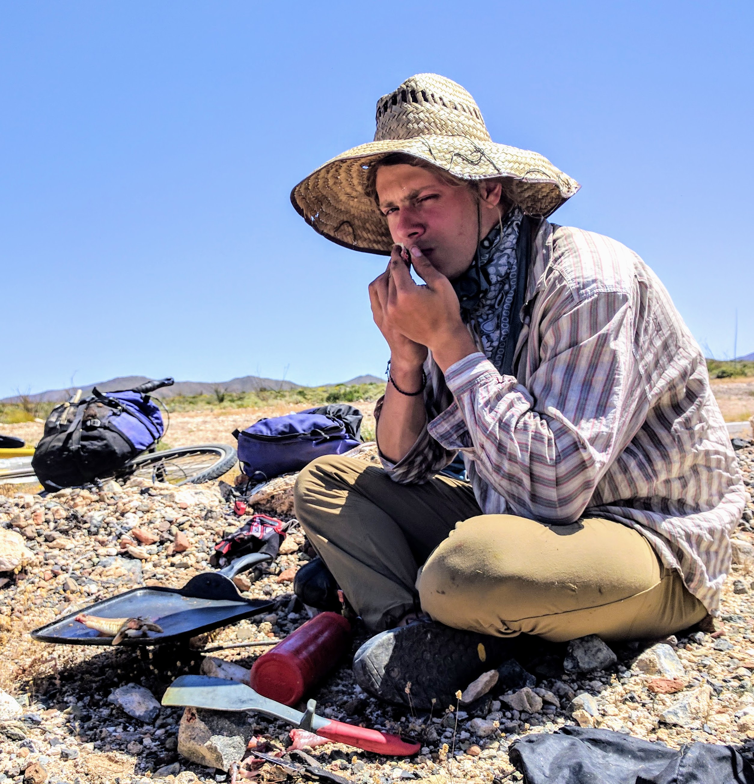 Frying fish that we had talked some sports fishing dudes out of, in the middle of the road, the evening before we aborted our ill-fated attempt to shortcut through the desert.