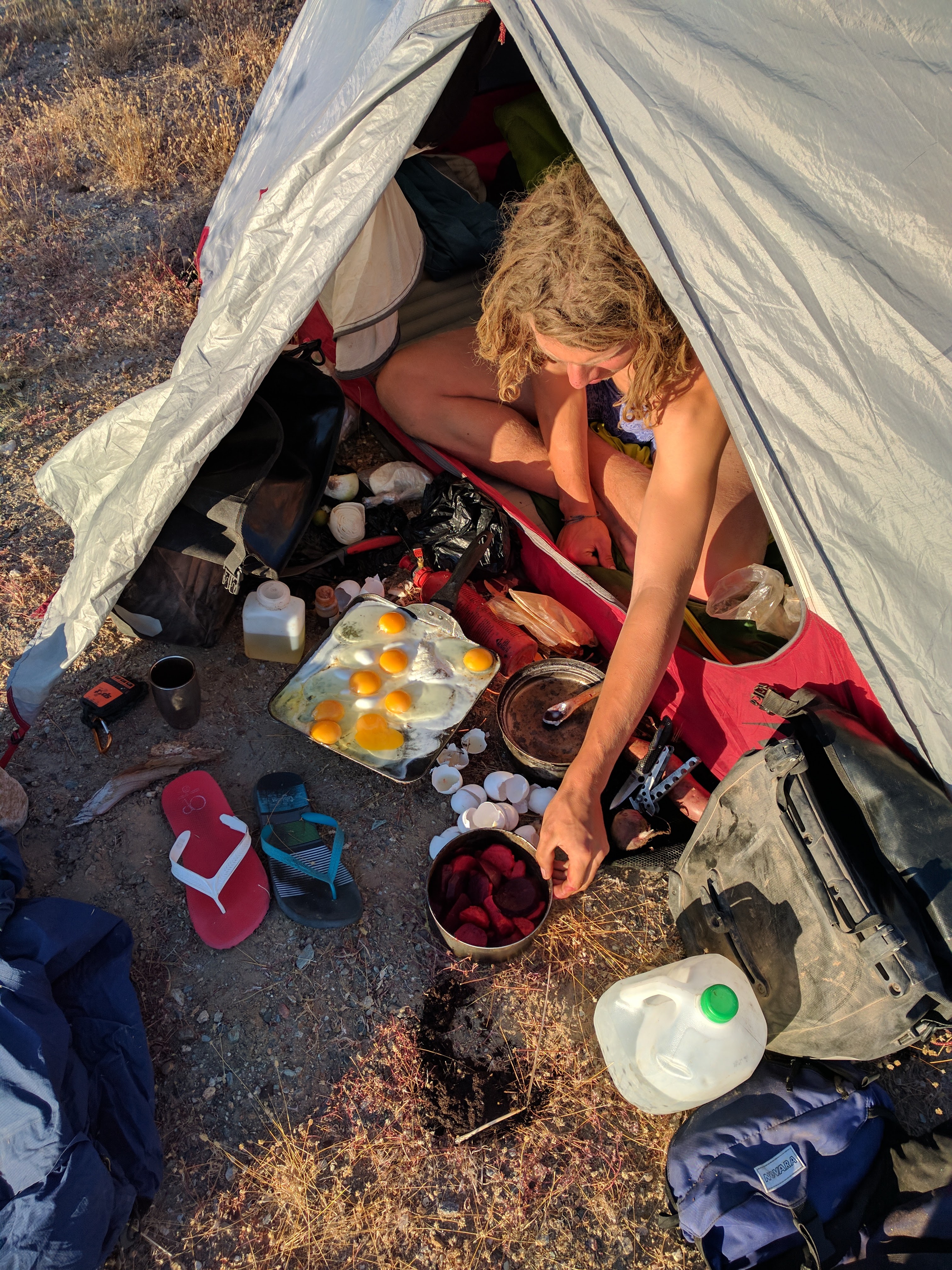 For one, I did not pack enough warm things to weather the nights here. With all my clothes on, in my bivvy and my $25 sleeping bag ordered off of Amazon just before I left (not wanting to repeat the mistake of lugging my bulkier sleeping bag through tropical weather), I am barely non-hypothermic at night when the moisture condenses on everything and the cold desert winds blow relentlessly. Last year, it was a couple of months later when I was this far South. Whoops. I suffered through 2 nights before accepting Hartley’s offer to share his tent. With me inside cheap sleeping bag, inside bivvy, inside tent, I’m comfortable at night.