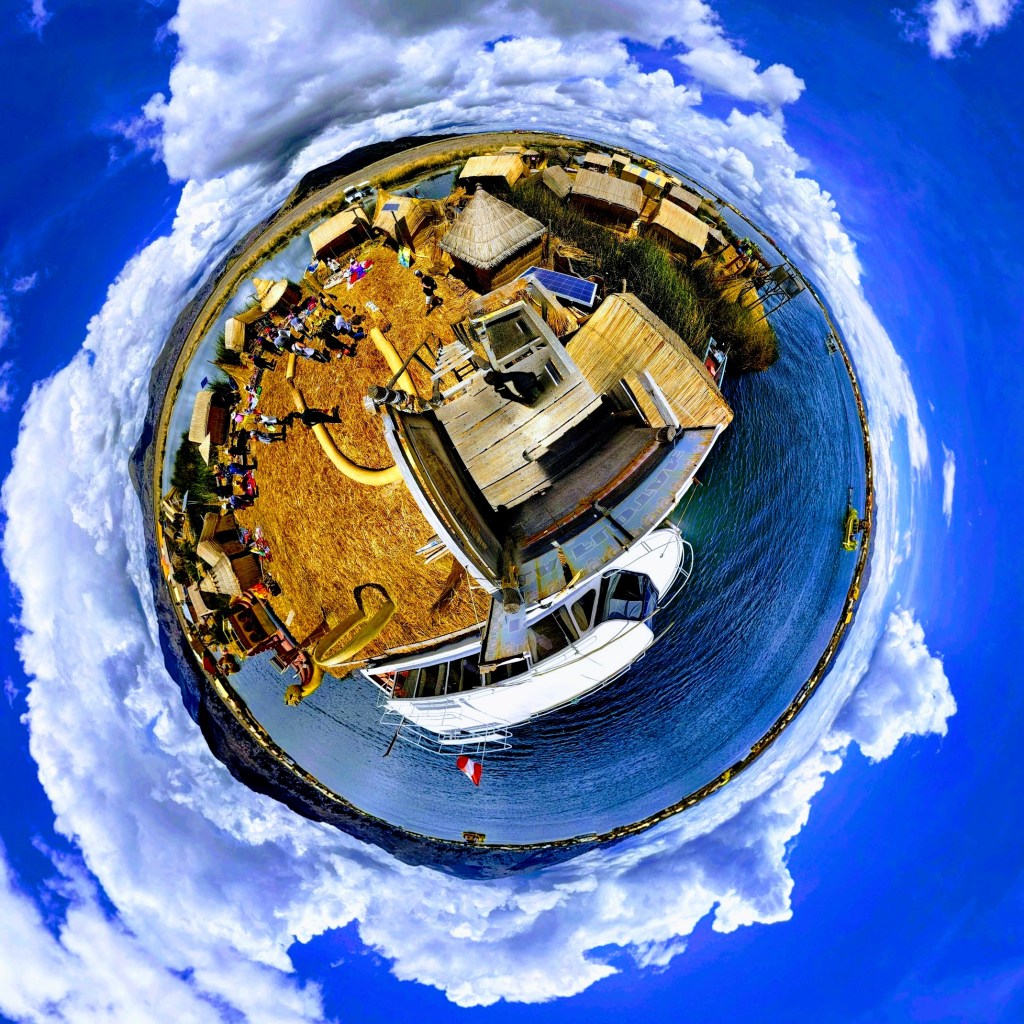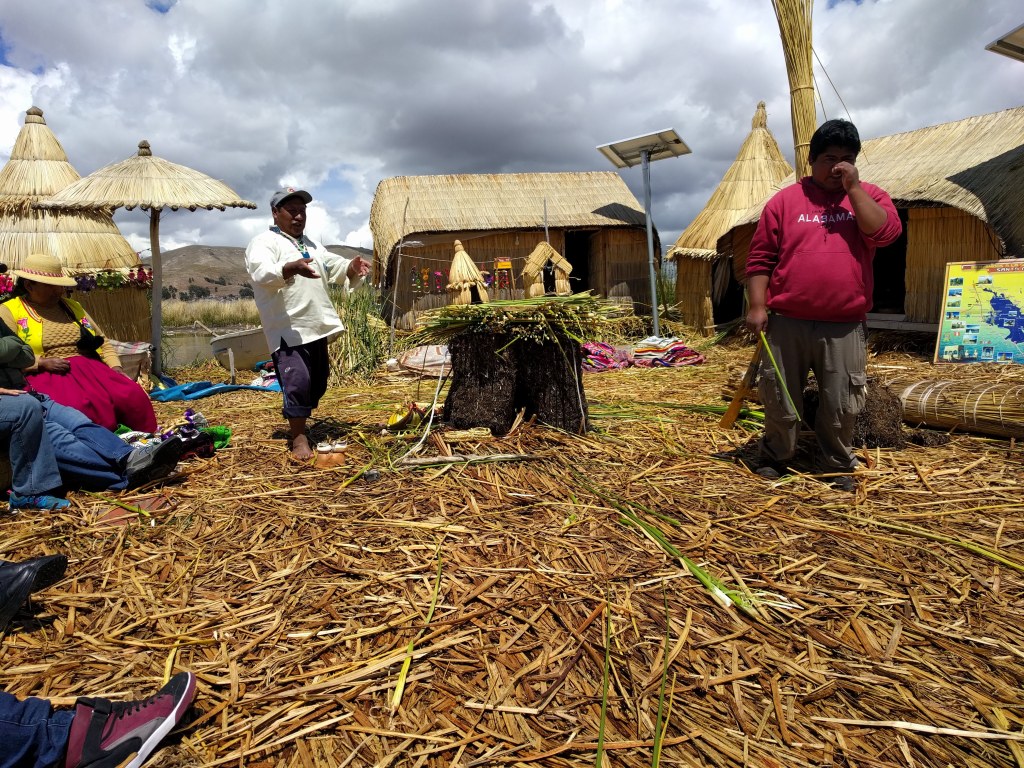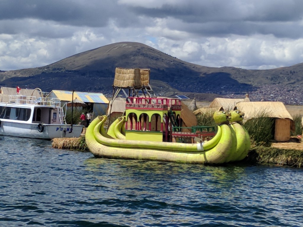 The next day, we do the standard Puno tourist experience together, taking a boat ride out to Uros, a cluster of floating islands on which people live…or at least the likes of which people used to live on, at some point in the past. These days, it’s a strange scene, with a clearly well-practiced staging of explanation of construction of and life on a 1-3 family reed-house-raft, invitation into a home which looks not-very-lived in and is decked out in merchandise available for sale, invitation for a reed-boat ride, with a couple embarking songs performed by the islands 6 inhabitants, for a modest additional fee, and then visit to a different reed island with a snack bar. It’s hard to say how genuine the whole thing is, and common among fellow tourist to speculate about whether most the people really still even live on those islands. In any case, the experience is at times cringe-inducing, but impossible to just forego entirely. In the end, I’m glad to have done the abbreviated 1/2 day version, rather than the multi-day version where you stay on one such island for the night, and visit one or both of the actual islands across which my boat-to-Puno trip would have taken me, had it been meant to be.