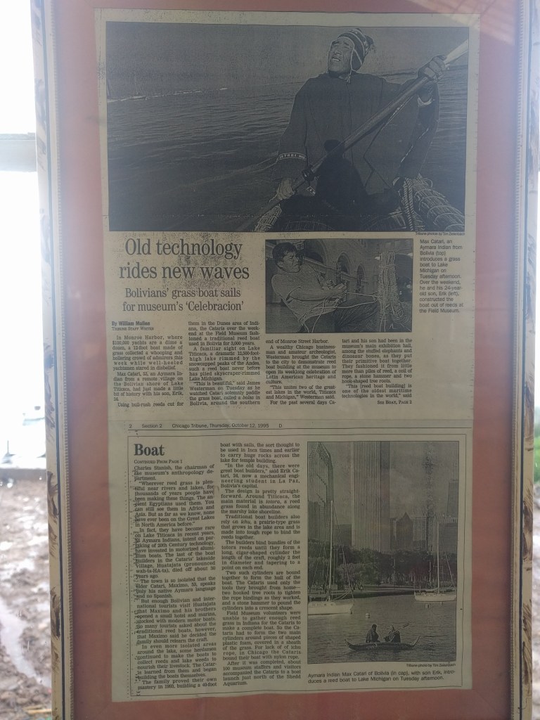 He seems happy with the gifts and then asks if I would like to see his museum. I do, and we go across the street where he unlocks the door and turns on the lights. Inside, the first exhibition are sails, posters, and other artifacts from a 28 day expedition he did around Lake Titicaca in a reed sailboat that he built, shortly before the Michigan trip. A larger exhibit shows the history of trans-oceanic voyages by explorers, done in proof of the concept that ancient people may have used such craft to sail from South America to Polynesia and other Pacific islands, instead of the other way around, as most historians theorize. My interest is piqued by the fact that the first such voyage was made by Thor Heyerdahl, a Norwegian explorer whose work on Easter Island I’d first come across a few years earlier. Maximilo seems content enough with my enthusiasm for the Heyerdahl portion of the exhibit that he leaves me the keys, and asks me to lock up and turn out the lights when I’m done. I spend the next hour pouring over the small but fascinating exhibits, which are almost exclusively posterboards with Spanish and English exposition and grainy photographs. The only other items on display are scale models of the reed boats that were used in the various expeditions. Towards the end of the exhibits, there’s a poster explaining that all the boats that were made for these dozens of proof-of-concept expeditions were made by members of 3 families, all of which reside in this town. Each family has a head member, and Maximilo is himself the head of the most prolific of these families.