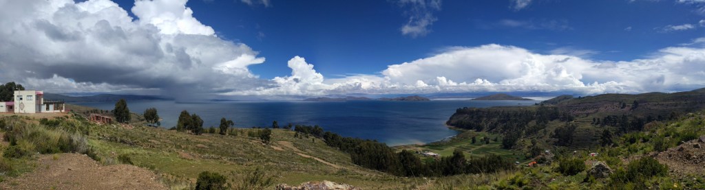 I make breakfast, and having not worked out details of how I’d share it with them, such as whether they would they come back out front or I should let myself into their home area? I assumed the former/easier option as I first made coffee, and then alternatingly made and consumed pancakes. Then the coffee suddenly had it’s predictable effect. I was already pretty full, contributing to said effect, and I had one last pancake, topped with sliced banana and chocolate sauce, freshly griddled in the pan. I walked back and found the mother doing laundry. I smile and offer the pancake, which she helps me re-offer to a toddler. Leaving the pan and fork on the table at which the toddler was standing on a chair, as if it’s just occurring to me to ask, I inquire about a bathroom. I’m pointed to the outhouse that I then walk rapidly to. Oh sweet relief! That out of the way, I chat with the dad a bit more, discussing the route the rest of the way to Bolivia and Copacabana. The mom returns my pan and fork, washed, as we say our goodbyes. Even though my Spanish still really, really sucks, these sorts of interactions demonstrate how far it’s come, at least in the context of being a particular kind of traveler.