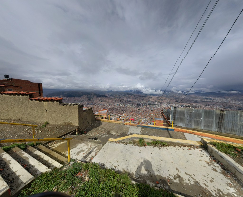 I’ve long since stopped having any visceral reaction to dog and other non-human animal carcasses in varying stages of disintegration, but just before I get into the greater urban sprawl of La Paz, I pass what I’m 98% sure is a human corpse about a meter off the side of the road. I’m 100% sure it’s human, but only 98% sure the guy is dead. His face is smashed in fairly badly, and there’s about a half gallon of blood/water mixture in a puddle next to his head, but what really impresses that he’s deceased is the eerily awkward way he’s positioned. As written so far, it sounds like I’ve approached the scene, calmly assessing the situation while slowly coming to a stop at the point on the road closest to the body. What actually happens is I begin to register what I’m seeing, as I zip by it at 20mph, and as it sinks in, my heart beat doubles and I utter “oh fuck fuck fuck fuck” and come to a halt about 10 meters past it. I’ve never seen a dead body outside of a funeral home before, and I’ve never been particularly good with gore. I’m a hypocritical carnivore that in found my way out of doing any frog or rat dissection in high school. I live in the cognitive space isolated from the grizzly aspects of animal nature that is afforded by modernity, and this has just popped that bubble. My first thought is to flag down a vehicle, and I try this about a half dozen times, but they’re all flying by at 70+mph and none are showing any signs of even slowing down. Somehow the body kinda blends in with its surroundings, and at that speed it’s likely not registering for vehicle inhabitants. Next, I bring myself to approach the body and try to, without touching it…this could well be a crime scene after all, determine if there’s any sign of life. I shout “HOLA?” a few times, and then watch for any sign of breathing, but everything about the body is lifeless. About 50 meters away, there’s a pullout with a driver standing next to his minivan, and beyond the pullout, a couple of men and a boy using shovels and wheelbarrows to move dirt. I ride up to the minivan driver, explain what I’ve seen, and ask if he knows the number to call the police. He says 011, and that the country code for Bolivia is 52, so I try a but my signal keeps cutting out. A few days later, I’ll read that there’s a Google Fi outage that may explain why I get signal for a few seconds after switching out of airplane mode, but never long enough to complete any calls (or do anything, for that matter). I ask the driver if he has a phone he can use, and he shrugs, nonchalantly. I’m still visibly shaken, but the driver seems predominately annoyed by being roped into the situation. I think, maybe he doesn’t understand how close the body is. It’s just beyond a pile of dirt, so I tell him I’m going to ride a few meters away, back to it, and point it out. I do, and when I turn around to look at him as I point it out, I see he’s driven off. I ride back to the pull out and this time talk to the 2 men working on the dirt. I ask them if they know that there’s a man just a few meters up the road who is probably dead. One of them responds with a shrug and a “sheesh, what are you gonna do” expression. The other tells me that there’s a police station about 12km ahead. They too convey the impression that they feel no sense of personal urgency, and that I’m being a bit of a nuisance by trying to involve them in the matter.